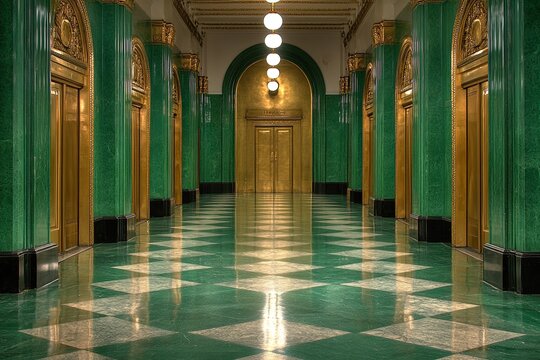 A beautifully designed corridor featuring green marble floors, golden elevator doors, and stylish lighting overhead. Generative AI