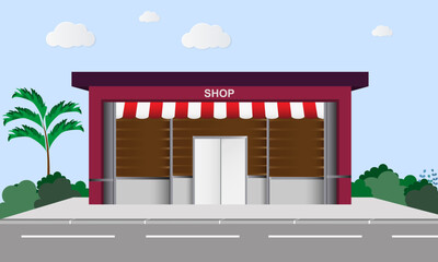 Showcase in city vector illustration, store building on city street. Supermarket, mall built in modern architectural style. real estate for retail or real estate. vector illustration.