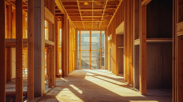 Hyper-realistic image of a construction site with sharp-focus. Light indigo and dark brown colors highlight architectural elements and materials