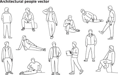 Diverse Collection of Line Art People in Various Poses for Architectural Renderings and Design Projects with Simple Style