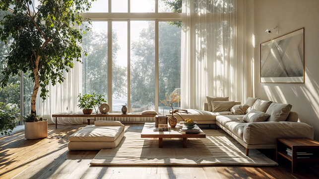 Modern minimalist living room with large windows and natural light, featuring stylish furniture and indoor plants