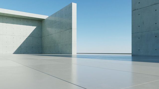 3d render of abstract modern concrete architecture background, Minimal geometry architectural design, Car presentation backdrop with empty concrete floor, Geometric white blocks building design