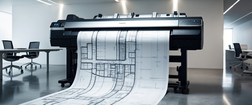Large-format printer displaying architectural blueprints in a modern office setting, emphasizing technology and design workflow.