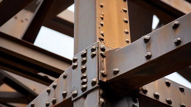 Detailed close-up of a weathered steel structure, showcasing industrial strength and architectural detail with visible rivets. Rust adds to its character.