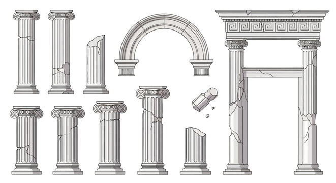 A detailed vector illustration set of ancient architectural ruins, featuring cracked stone pillars, columns, and classic arches