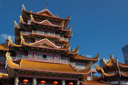 A Multi-Story Temple Featuring Traditional Chinese Architectural Style with Ornate Roofs and Red Lanterns Against a Clear Blue Sky