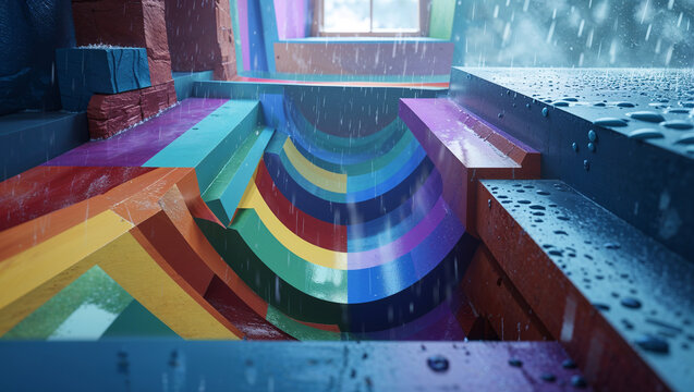 A colorful architectural design subject to rain showers with artistic and abstract elements