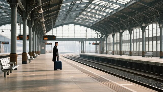 A wide shot of a nearly empty train station platform. Only the subject is present, waiting.
