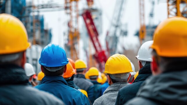 Construction Workers at Construction Site with Cranes, Wearing Hard Hats, Building Infrastructure, Teamwork and Dedication