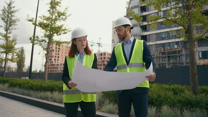 Professional engineers inspecting architectural plans