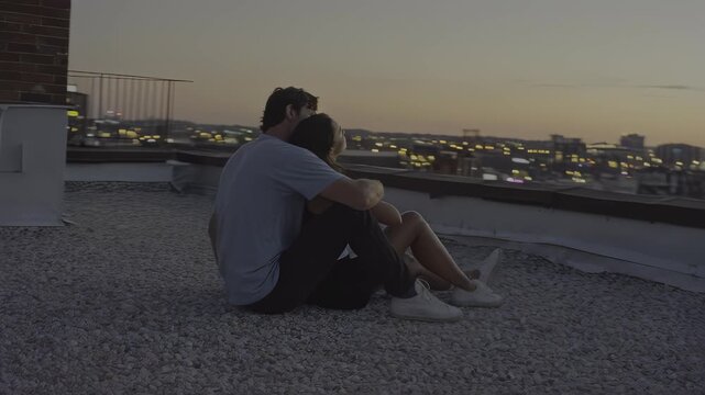 Cozy reading nook with a view of the city skyline and bookshelves filled with books
