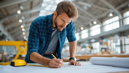 Engineer Working on Blueprint in Workshop with Tools and Equipment