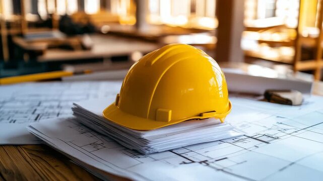 Yellow construction helmet on architectural blueprint with pencil and eraser on wooden table symbolizing safety planning and building project management in construction architecture environment