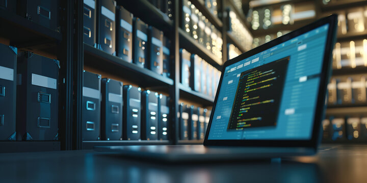 Cluttered archive room filled with shelves of boxes and piles of documents, capturing a busy office environment, records management, and the need for organization.