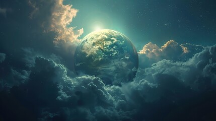 A blue marble planet with continents, oceans, and a white cloud atmosphere hangs in the vast blackness of space, dotted with twinkling stars