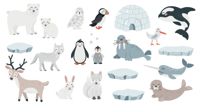 Set of cute cartoon arctic animals in flat style. Wild polar fauna design elements for printing, poster, card. Vector illustration