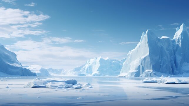A large ship rests in the icy waters, surrounded by floating icebergs and snow covered mountains. Soft clouds mirror on the calm water at twilight, creating a serene atmosphere.
