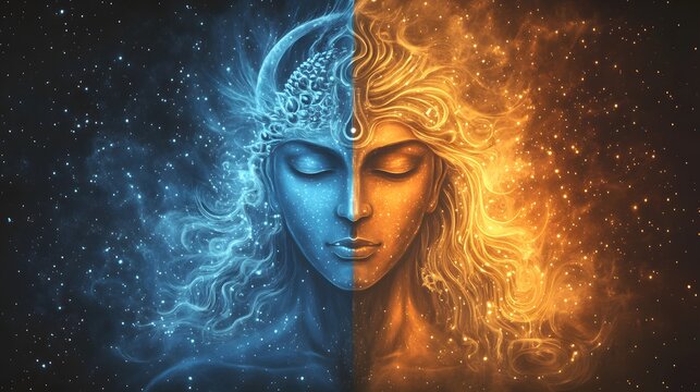 High detail and  hyper realistic, illustrative image of Ardhanarishvara