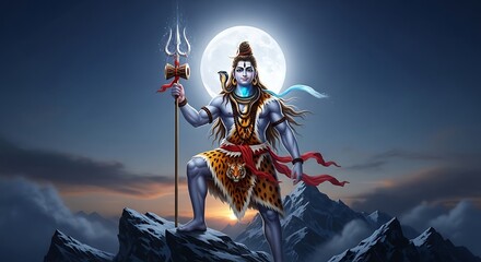Lord Shiva standing on mountain peak with trident and full moon background.