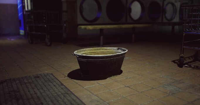 A solitary bucket sits on the floor of an almost empty laundromat. The quiet atmosphere is enhanced by the soft glow of washing machines, creating a calm yet eerie setting.