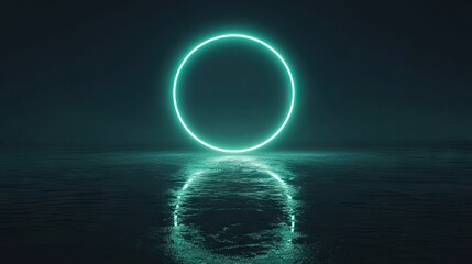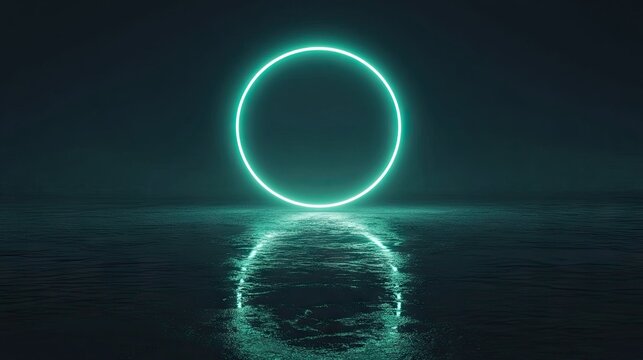 A glowing neon geometric circle, made of bright green and blue lights, floating on a dark, almost empty background. The soft glow creates a calming yet futuristic vibe.