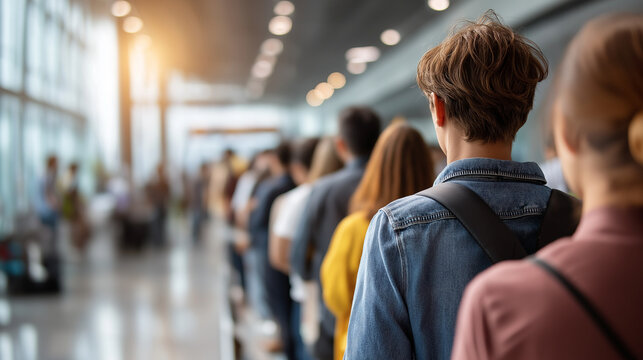 Crowded airport terminal long queue passport control checkpoint travelers standing line waiting immigration process scene border control area defocused terminal background