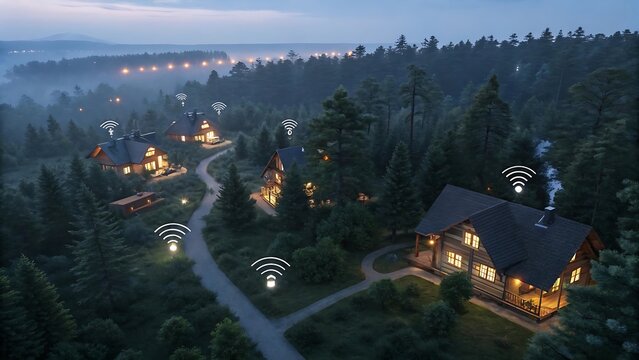 Night view of rural houses with glowing wireless icons representing high-speed internet and eco-friendly digital connectivity development