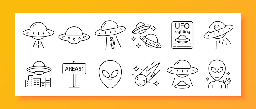 UFO set icon. Spaceship, alien, abduction, meteor, star, galaxy, planet, space, report, Area 51, mystery, science fiction, sighting, flight, sky, extraterrestrial, cosmos, discovery, UFO, night