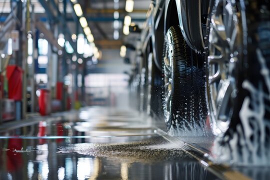 A detailed image of a car's wheels being cleaned by spinning brushes in an automatic car wash. The brushes are effectively removing dirt and grime, while water jets rinse the area. The background incl
