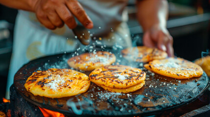 A close-up view showcases freshly made Venezuelan arepas also known as cachapas, sizzling on a steaming black grill, emanating irresistible aromas and flavors