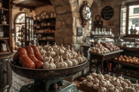 Traditional sausages and garlic displayed on a vintage scale inside a rustic shop interior