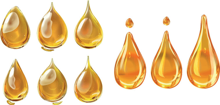 Shine yellow droplets. Realistic oil drops isolated on white background. Vector liquid drip juice honey petrol. Illustration realistic oil liquid, droplet transparent natural, golden essence collagen