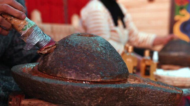 Extraction of argan oil by traditional stone hand mill in Morocco