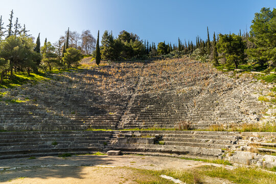 Argos, Greece - 19 February 2023 - The old ruins of the ancient theater of Argos. Old archeological site