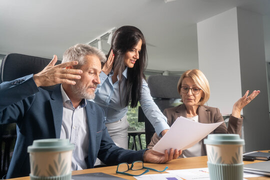 A man and woman in business suits stand back to back with their arms crossed, looking confused.