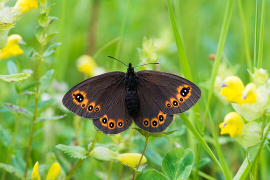 The Scotch argus ( Erebia aethiops ) found in meadows in Europe - selective focus, space fot text