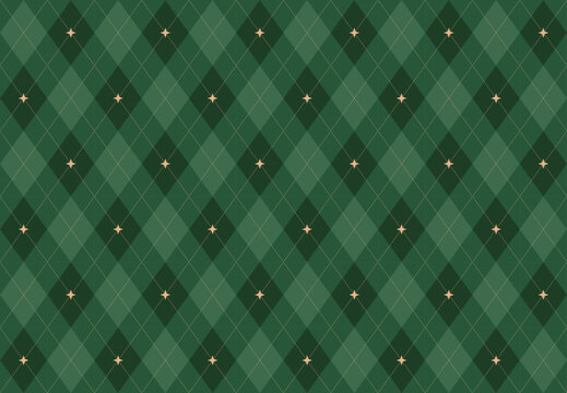 Christmas rhombus seamless pattern. Xmas plaid texture with gold line and stars. Green argyle geometric diamond abstract pattern. Christmas wrapping. Vector illustration isolated on green background.