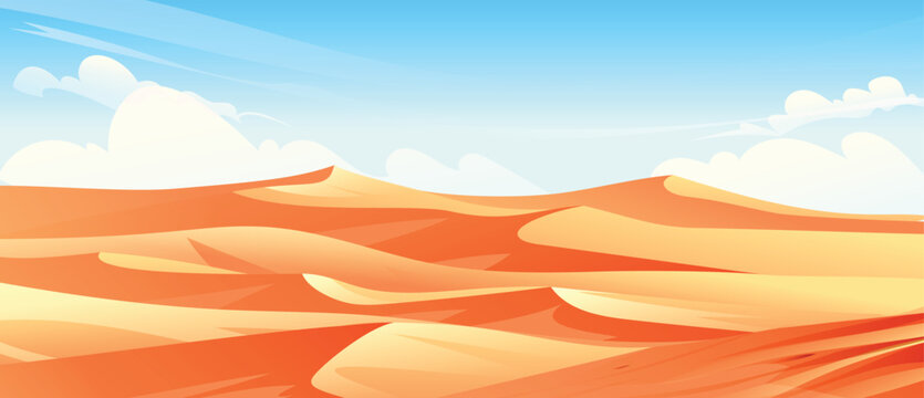 Expansive desert landscape with sand dunes and blue sky. Nature background vector cartoon illustration