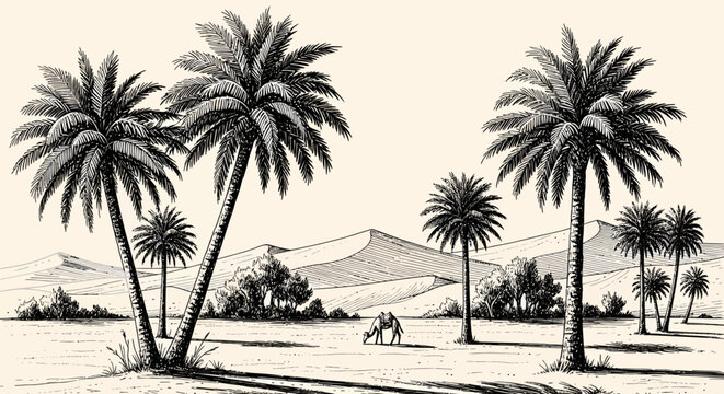 Illustration of a desert landscape with palm trees, sand dunes, and a camel grazing in the foreground.