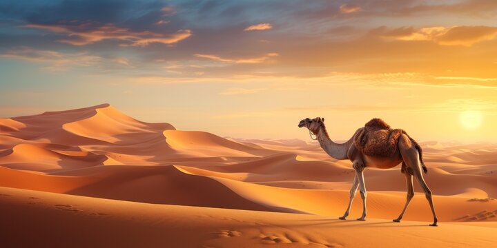 Majestic creature leaps through desert sand dunes; fantastical creature, desert landscape