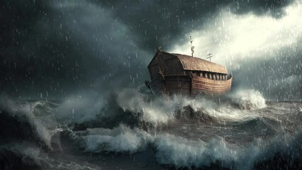 Visualize Noah's Ark resting on Mount Ararat after the floodwaters recede. Include a majestic rainbow in the sky as a symbol of God's promise. Show Noah and his family emerging from the ark