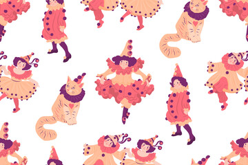 Seamless pattern with children in carnival costumes and funny cat in cap. Vector illustration.