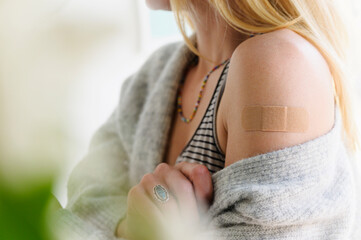 Close-up shot of a bandage on the woman arm after having blood taken