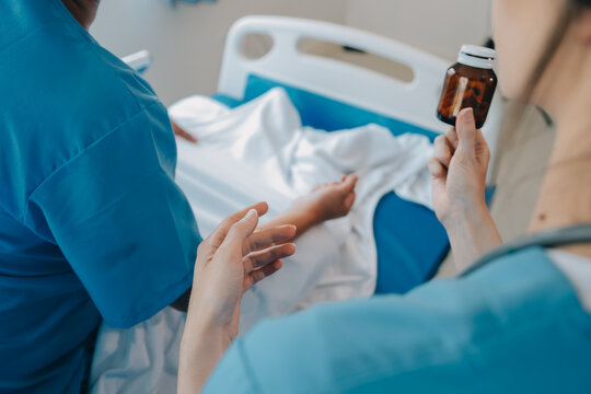 Injured patient showing doctor broken wrist and arm with bandage in hospital office or emergency room. Sprain, stress fracture or repetitive strain injury in hand. Nurse helping customer. First aid.