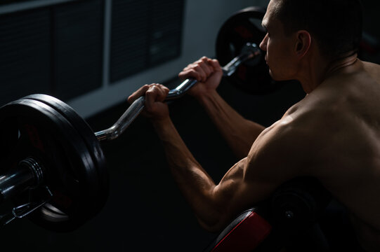 Determined young guy training his forearms using arm curl machine in fitness hall