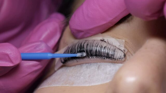 Face of young girl before eyelash lamination procedure in a professional beauty salon. The master washes off the black paint on the eyelashes during the eyelash curling procedure with a special brush.