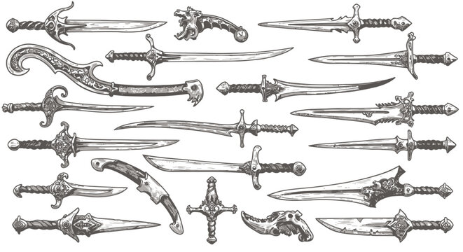 A comprehensive collection of hand-drawn vector swords and daggers, featuring an array of medieval and fantasy-inspired blades perfect for graphic design projects.