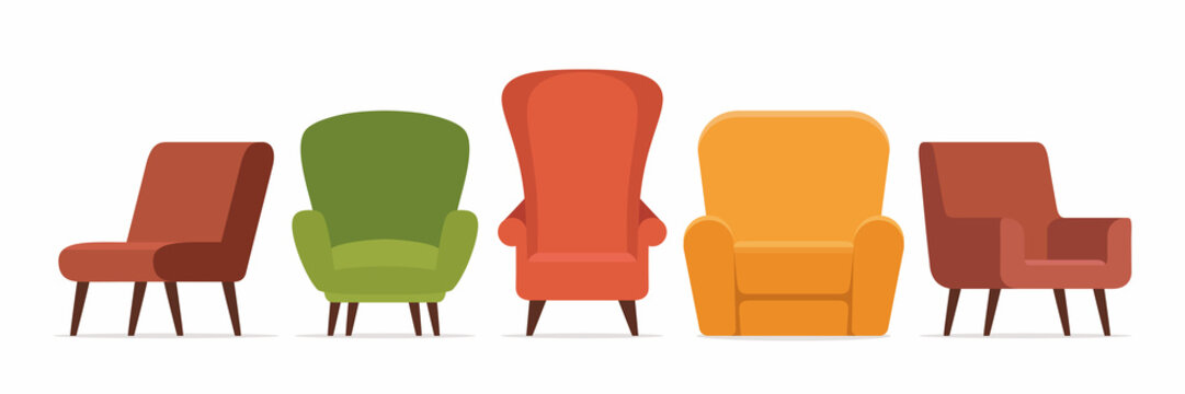 A line of fashionable armchairs. Comfortable Armchairs. Soft furniture for rest and relaxation. Furniture store advertising. Room decoration, interior. Vector illustration.