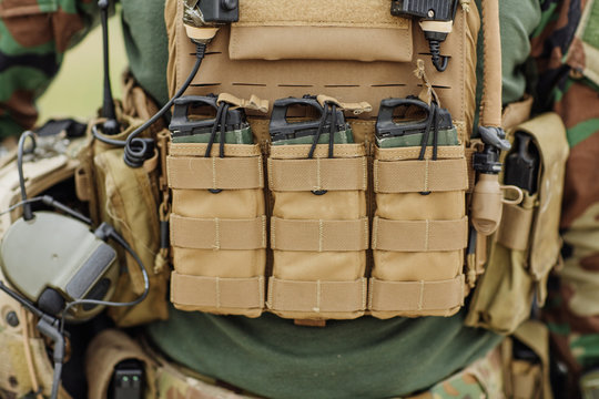 Squad of Three Fully Equipped and Armed Soldiers Standing on Hill in Desert Environment in Sunset Light.