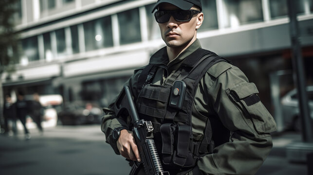 Security guard, safety officer and bodyguard man with a gun outdoor to patrol, safeguard and watch. Serious asian male at a building or property for crime prevention or armed response with a weapon